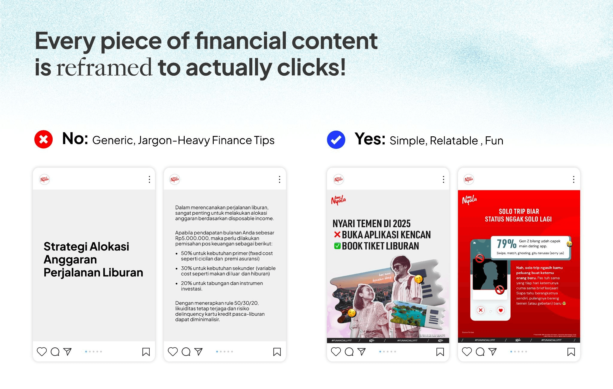 Gen Z has the lowest financial literacy of all age groups (SNLIK 2024 – OJK & BPS). This makes them more likely to fall into the trap of online loans and impulsive spending, fueled by YOLO and FOMO culture. But here’s the real challenge: Most financial content online feels too formal, full of bank jargon and boring numbers. It doesn’t speak to Gen Z’s world, so they scroll away. That’s where creative marketing and relatable content marketing come in.